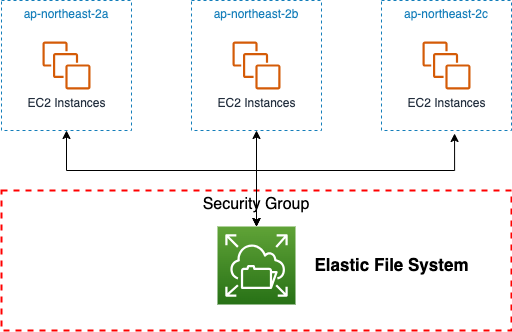 - 위에 이미지를 보시면 EFS 파일 시스템이 있고, 보안 그룹으로 둘러싸인 모습을 볼 수 있다.