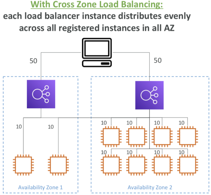 각각의 로드 밸런서 인스턴스가 모든 가용 영역에 등록된 모든 인스턴스에 부하를 고르게 분배한다.