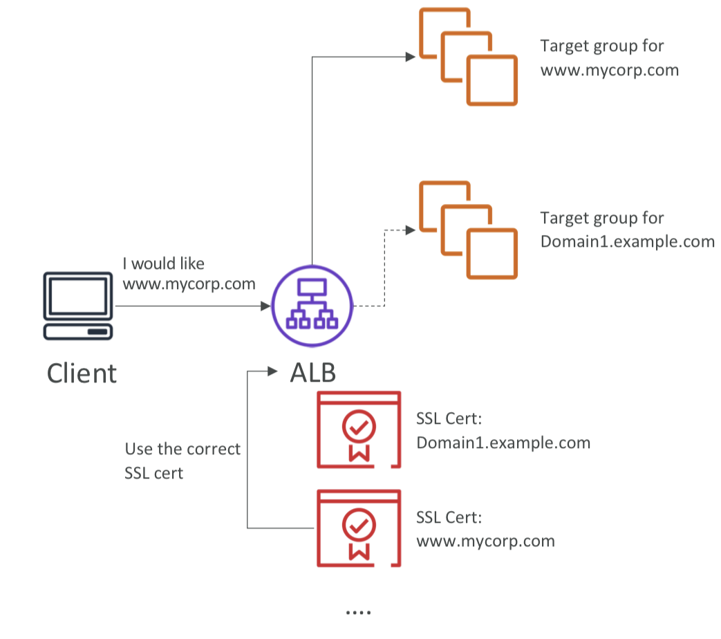 해당하는 인증서를 가져와 트래픽을 암호화한 다음, 규칙에 따라 대상 그룹인 mycorp.com으로 요청을 재전송해야 한다. - 만약, 또 다른 클라이언트가 ALB에게 Domain1.example.com에 접속을 요구한다면, 역시 해당하는 SSL 인증서를 가져와 원하는 대상 그룹으로 연결해 줄 것이다.