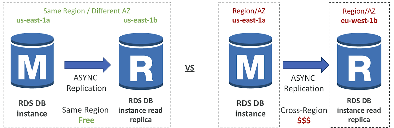 즉, us-east-1a에 대해서 복제본이 eu-west-1에 존재하는 경우에는 RDS DB 인스턴스와 읽기 전용 복제본이 여런 리전을 넘나들어야하기 때문에 네트워크에 대한 복제 비용이 발생한다.