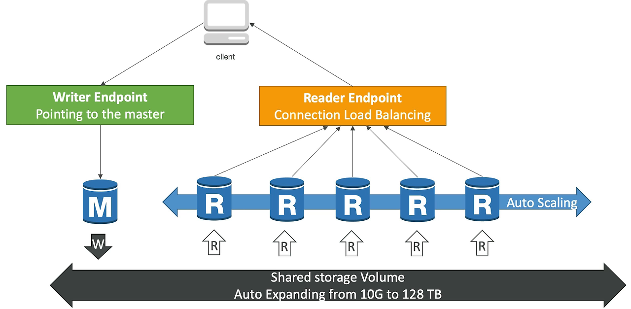 따라서, 장애 조치 후에도 클라이언트는 라이터 엔드포인트와 상호작용하게 되며 올바른 인스턴스로 자동으로 리다이렉트된다. - 위의 이미지에 다수의 읽기 전용 복제본이 있고, 읽기 전용 복제본을 15개까지 생성 가능하며 자동 스케일링을 설정해서 항상 적절한 수의 읽기 전용 복제본이 존재하도록 할 수 있다.