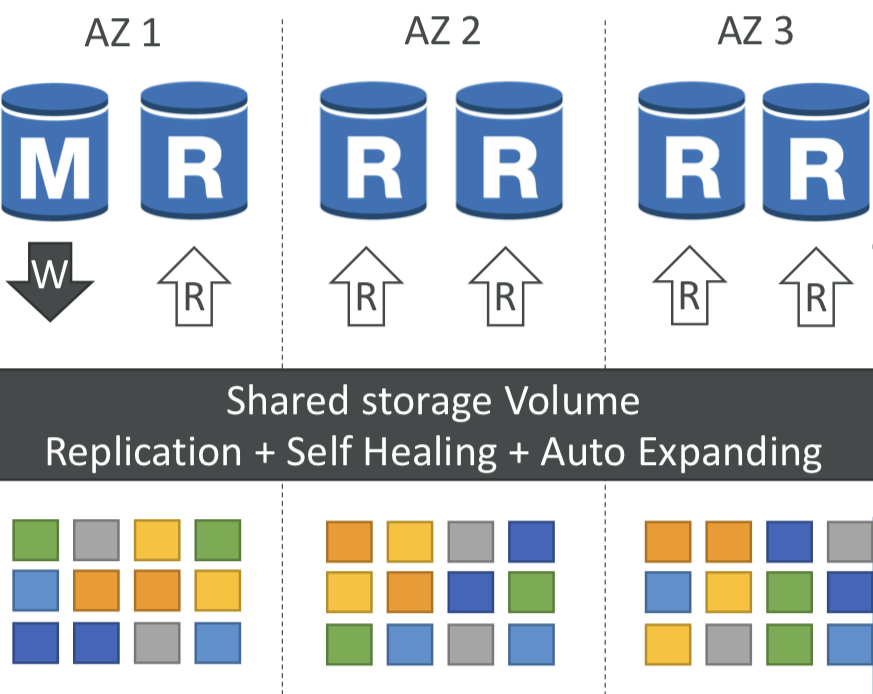 복제, 자가 복구, 그리고 자동 확장 기능을 수행한다. - 만약 파란색의 데이터를 여기에 쓰게되면 각기 다른 세 AZ에 6개의 사본이 생긴다.