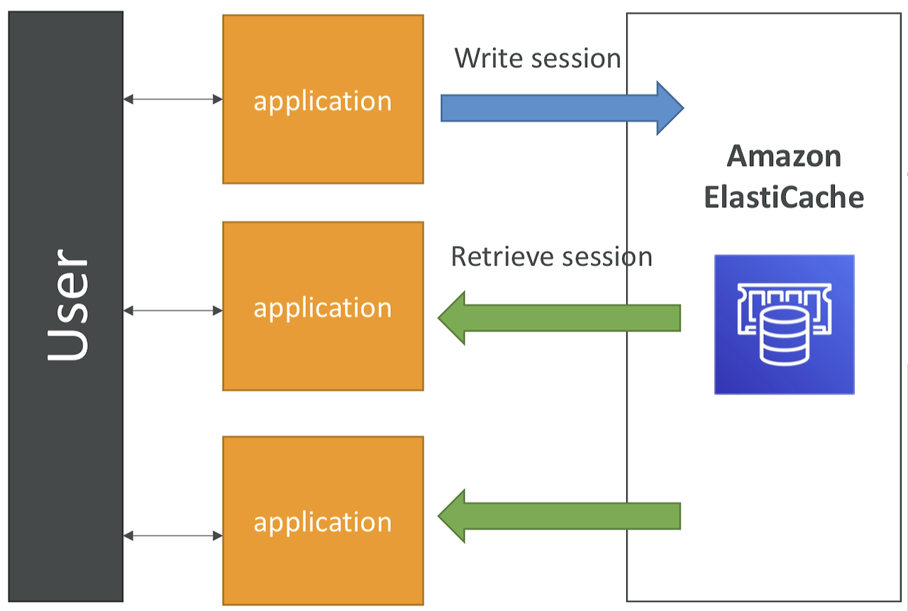 = 즉, 사용자가 어떤 애플리케이션에 로그인하면, 애플리케이션이 세션 데이터를 Amazon ElasticCache에 사용하는 것이다. - 사용자가 애플리케이션의 다른 인스턴스로 리디렉션되면, 애플리케이션은 그 세션의 새션 캐시를 ElasticCache에서 직접 검색할 수 있으므로, 사용자는 여전히 로그인 상태인 것이다. 다시 한번 더 로그인 할 필요가 없다.