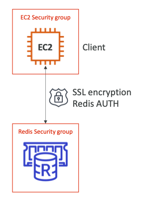 - 예를 들어, EC2 인스턴스와 클라이언트가 있는 경우 Redic AUTH를 사용하여 Redis 클러스터에 연결 할 수 있고, Redis 보안 그룹에 의해 보호된다. 또한 인플라이트 암호화를 사용하거나, Redis에서 IAM 인증을 활용할 수 있다.