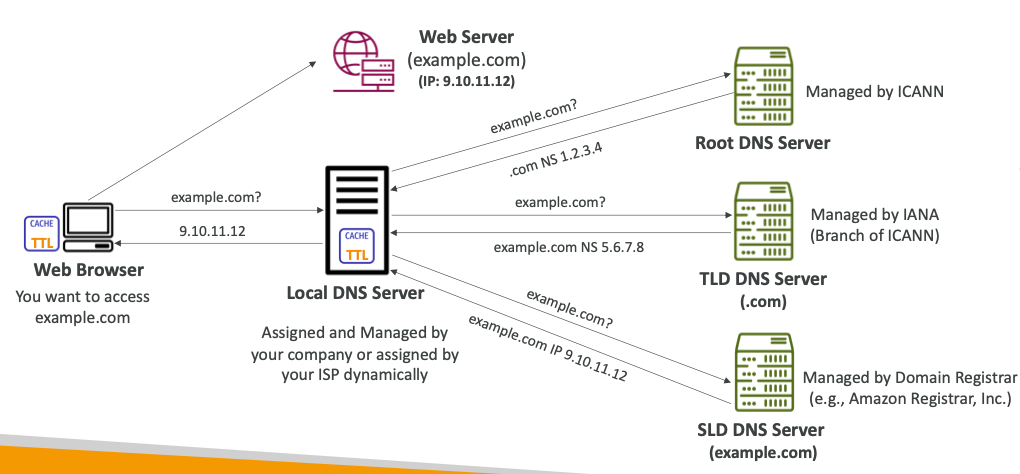 - 웹 브라우저가 example.com에 접근하기 위해서 로컬 DNS 서버에 물어본다.