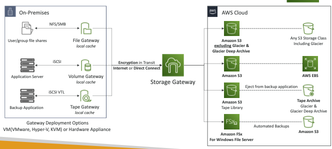 - 온프레미스에서 Storage Gateway VM을 배포하거나 하드웨어 어플라이언스에서 배포할 수 있는데 Storage Gateway 서비스와 AWS 클라우드로 도표처럼 나뉜다.