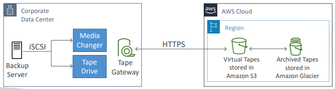 - 도식을 보면 테이프 기반인 회사 데이터 센터의 백업 서버가 있을 때, 테이프 게이트웨이가 이를 클라우드에 연결하여 Amazon S3나 Amazon Glacier에 해당 테이프르 저장하는 방식이다.