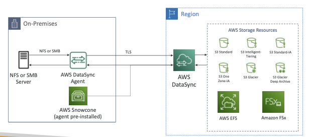 - AWS라고 하면 S3, EFS 혹은 FSx일텐데, 온프레미스와 DataSync가 실행되는 AWS 리전이 있다. 온프레미스에 NFS 또는 SMB 서버가 있는데 이때 온프레미스에 AWS DataSync 에이전트를 설치하고 이를 NFS 또는 SMB 서버에 연결시켜서 이 에이전트를 이용하여 암호화를 거쳐 DataSync 서비스에 연결한다. 이 연결은 어느 위치로든 갈 수 있다. Amazon S3 버킷의 스토리지 클래스나 AWS EFS 혹은 Amazon FSx 일수도 있다.