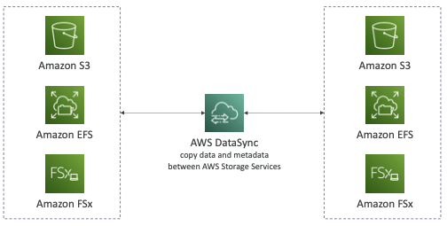 - S3, EFS 또는 FSx를 S3, EFS, FSx로 다시 동기화하려는 경우, AWS DataSync 서비스를 사용하여 데이터 복사본을 만든다. 서로 다른 AWS 스토리지 서비스 간 메타데이터 또한 유지된다.