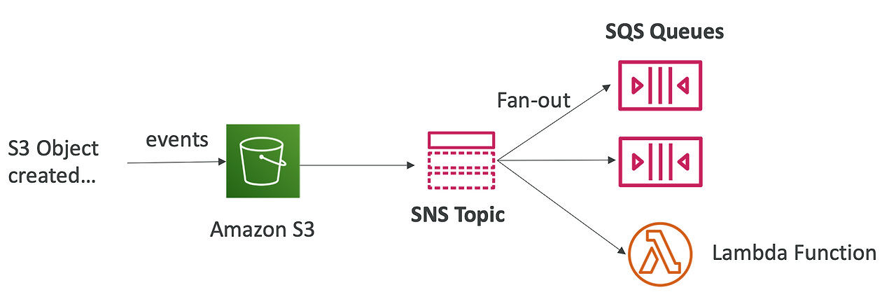- 예를 들어, S3 버킷에 객체가 생성되어 이벤트가 발생했을 때, 이벤트를 SNS 토픽으로 전송하고 여러 개의 대기열이 SNS 토픽에 Fan Out 패턴으로 구독하게 하면 된다.