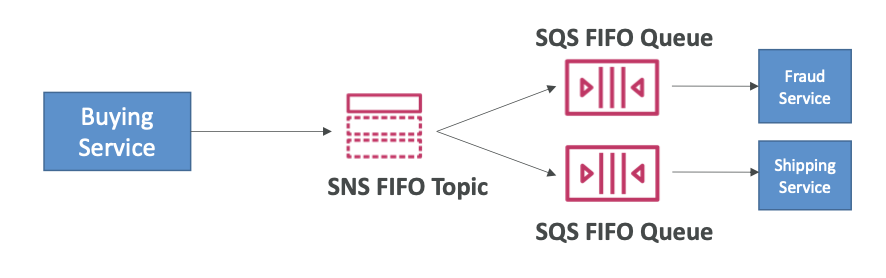 - 구매 서비스는 SNS FIFO 토픽으로 데이터를 보낼 것이고, 그건 두 개의 SQS FIFO 대기열로 Fan Out 될 것이다.