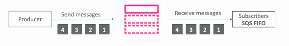 - 위의 이미지에서 생산자가 메시지를 1, 2, 3, 4 순서로 보내면 일단 구독자는 SQS FIFO 대기열이 될 수 밖에 없는데 1, 2, 3, 4 순서로 메시지를 받는다.