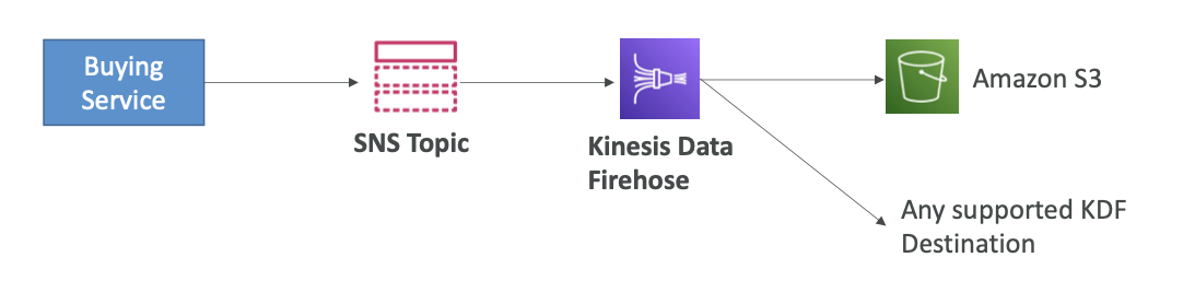 - SNS가 KDF와 직접적으로 통합되어 있기 때문에 구매 서비스가 SNS 토픽으로 데이터를 전송할 수 있고, KDF가 그 정보를 받을 것이다.