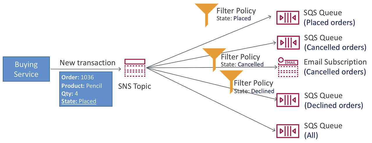 - 취소된 주문에 대한 SQS 대기열도 있을 수 있다. 취소된 주문에 적용할 필터링 정책을 생성해서 같은 SNS 토픽에서 SQS 대기열로 가도록 한다. 그러면 발주된 주문과 취소된 주문의 SQS 대기열들은 같은 메시지를 받기 않을 것이다.
