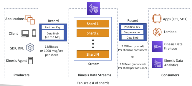 - 생산자는 SDK, Kinesis Producer Library(KPL), Kinesis Agent를 사용하여 데이터를 전송할 수 있고 소비자는 Kinesis Client Library(KCL)나 SDK를 써서 직접 데이터를 작성할 수 있다.