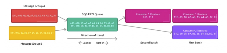 - 그룹 ID를 사용하면 FIFO 대기열은 FIFO 내부에 두 개 그룹이 생기고 정의한 그룹마다 각각 소비자를 가질 수 있게 된다.