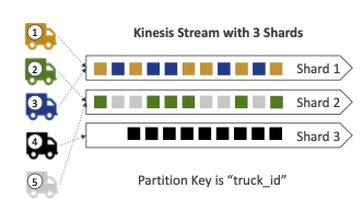 - 트럭 1은 계속 트럭 1이라는 동일한 파티션 키를 전송하므로 데이터가 언제나 같은 샤드로 이동한다. 그러므로 트럭 1의 다음 데이터 지점은 샤드 1로 가고, 트럭 3의 다음 데이터 지점도 샤드 1번으로 계속 이동한다. 즉 트럭 1이 데이터를 보내면 꼭 샤드 1번으로 이동하고 또한 파란색 트럭인 트럭 3이 데이터를 보내도 샤드 1번에 정렬된다.