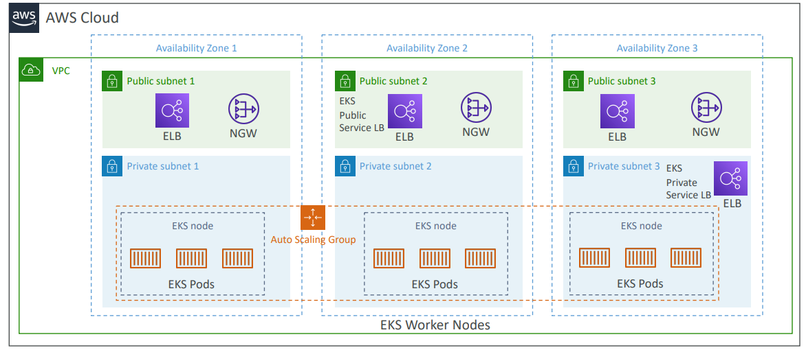 - VPC와 세 AZ가 있고, 각 AZ는 퍼블릭 및 프라이빗 서브넷으로 나뉜다.