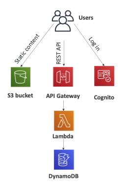 - API Gateway를 통해 사용자는 REST API를 호출하고 API Gateway는 람다 함수를 호출하고 람다 함수는 DynamoDB에서 데이터를 저장하고 회수한다.