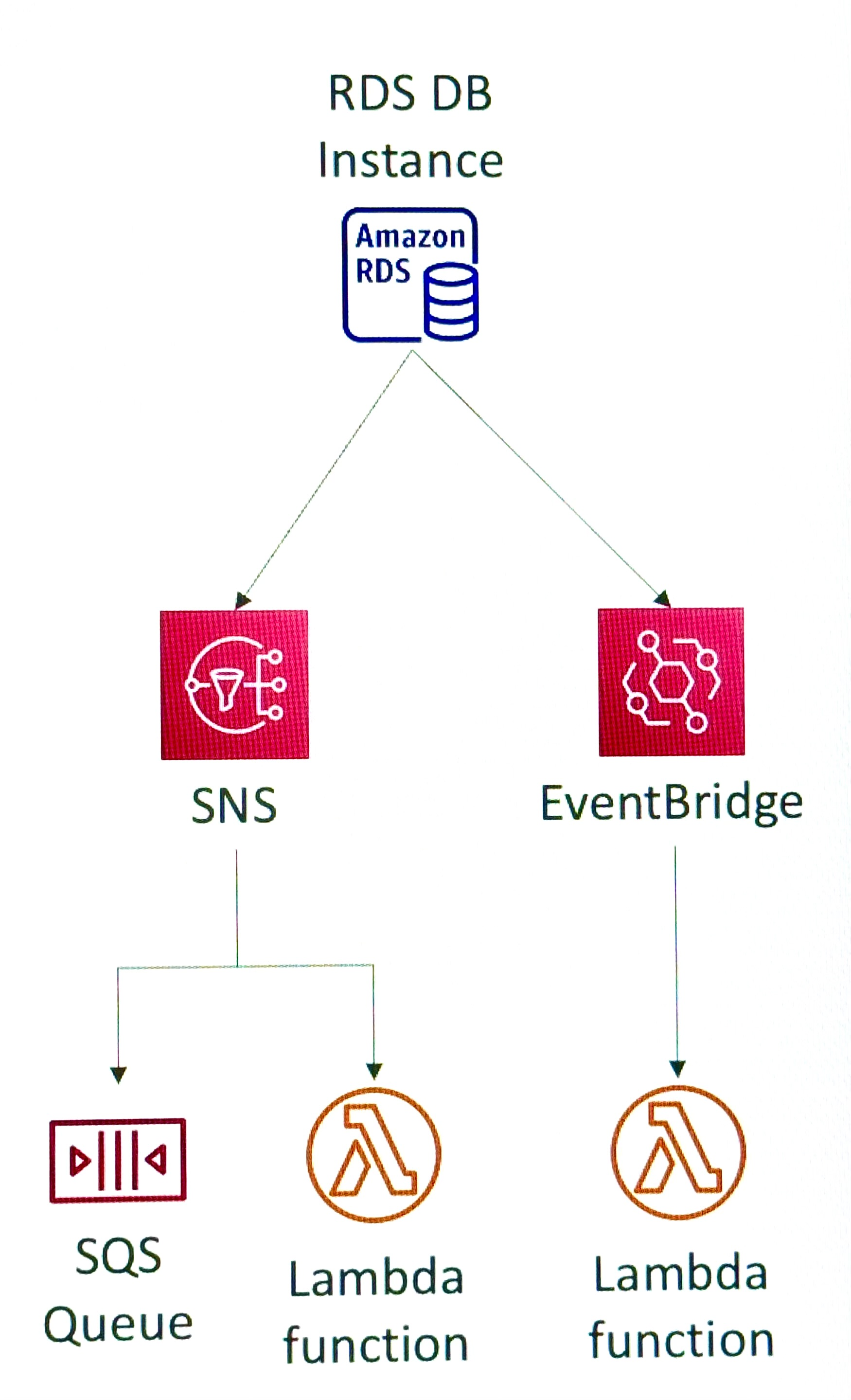- 데이터베이스 안의 데이터에 관한 정보는 받지 않을 것이다. - 전달 시간이 최대 5분인 근 실시간 이벤트를 받고, 그걸 SNS에 전송하거나 그것들을 EventBridge에서 가로챌 수 있다. 그럼 SNS에서 예를 들어 SQS 대기열이나 람다 함수로 그것들을 전송할 수 있다.