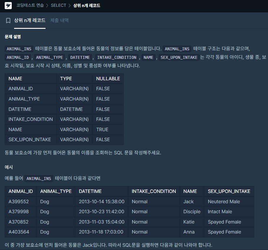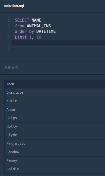 2. 가장 보호소에 먼저 들어온 동물 순이니깐 order by 절로 사용하여 오름차순으로 정렬해주어야겠구나