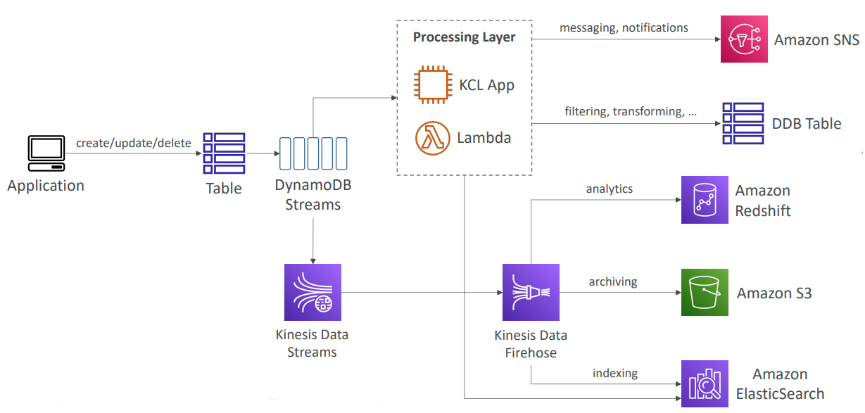 - 애플리케이션이 DynamoDB 테이블에서 작업을 생성, 업데이트, 삭제하면 이는 DynamoDB 스트림이나 Kinesis Data Stream로 전송된다.