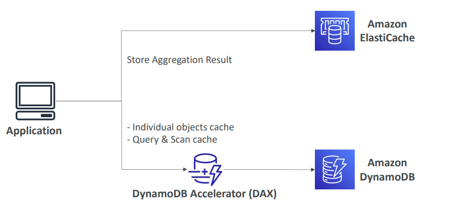 - 예를 들어 집계 결과를 저장할 때는 Amazon ElastiCache가 좋고, Amazon DynamoDB는 대용량의 연산을 저장할 때 좋다.