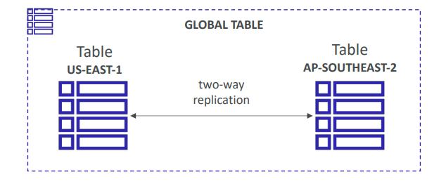- US-EAST-1이나 AP-SOUTHEAST-2 테이블 둘 중 하나에 쓰기를 하면 된다는 뜻이다. - DynamoDB 글로벌 테이블은 복수의 리전에서 짧은 지연 시간으로 액세스할 수 있게 해준다.
