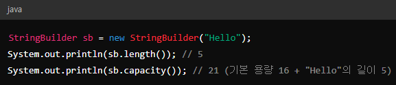 cf ) StringBuilder 객체는 다양한 메서드를 제공하는데 메서드 종류는 이 글 마지막 부분에 정리해놓겠습니다.