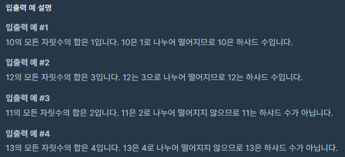 그리고 if문으로 하샤드 수를 판단해줍니다.