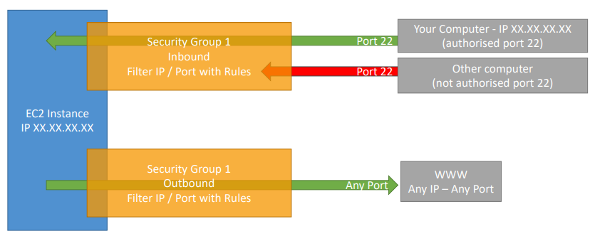 - 22번 포트에서 인증을 받게되고 트래픽은 컴퓨터에서 EC2 인스턴스로 이동할 수 있다. 하지만, 사용자의 IP 주소를 사용하지 않는 다른 사람의 컴퓨터가 EC2 인스턴스에 액세스 하려고 하면 방화벽이 차단되고 타임아웃이 되기 때문에 통과하지 못한다.