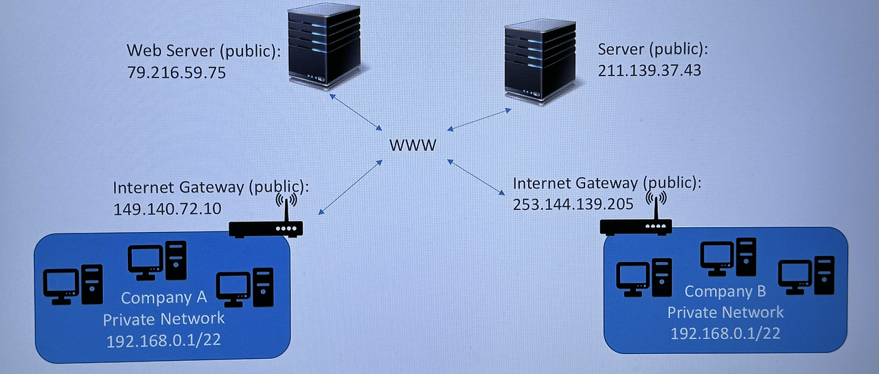 - IP가 사설 네트워크안에서만 유일한 것이다. 즉, 두 개의 다른 회사는 같은 사설 IP를 가질 수 있고 문제가 되지 않는다.