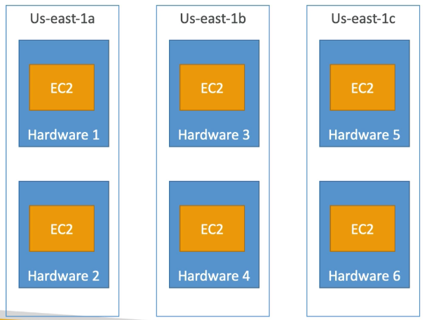 - 밑의 이미지에서 볼 수 있듯이 3개의 가용 영역과 6개의 EC2가 있고, 각 EC2 인스턴스는 서로 다른 하드웨어에 있다.